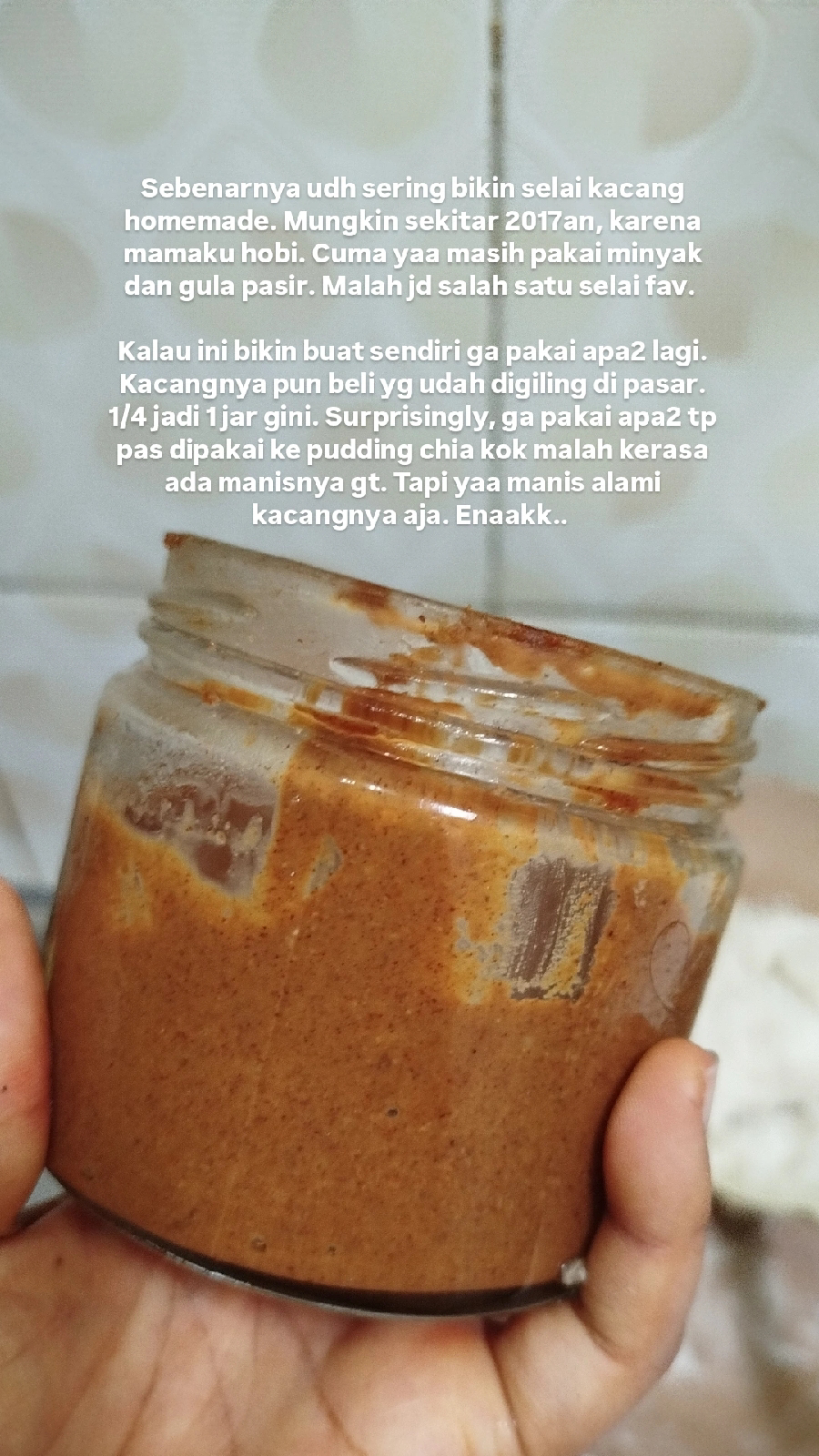 Dan baru-baru ini kucoba bikin selai kacang buat mamaku dengan versi lebih sehat juga dengan menggunakan minyak kelapa dan stevia. Sejujurnya, aku belum bilang ke mamaku kalau selai kacang yang aku bikin buat beliau nggak pakai minyak goreng dan gula pasir seperti biasanya karena khawatir mamaku kurang sreg hehe.. Karena beliau masih belum terlalu aware tentang itu, tapi kalau beliau lihat aku pakai di makananku ya gapapa. Semoga nanti ada waktunya aku bilang, istilahnya sekarang lagi trial dulu, kalau beliau ok ya berarti bisa aku bikinkan dengan bahan begitu lagi. Hehe..